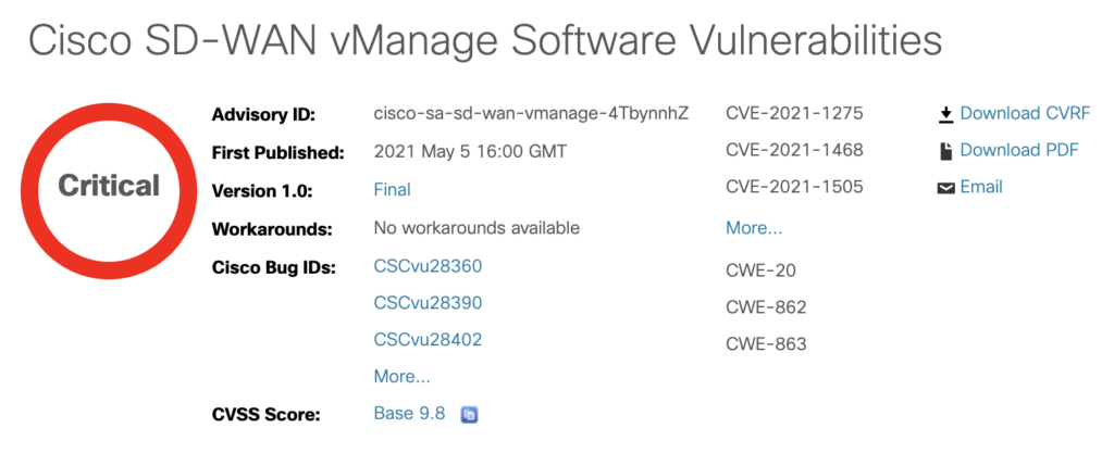 Cisco SD-WAN vManage Software の脆弱性は、攻撃者が無認証でリモートから任意のコードを実行したり、機密情報にアクセスしたりできる可能性があります。2021年5月5日に Cisco がパッチを提供しています。