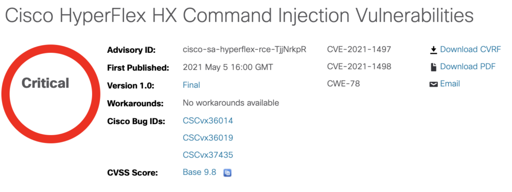 CVE-2021-1497:Cisco HyperFlex HX インストーラの仮想マシンコマンドインジェクションの脆弱性(CVSS Base Score: 9.8)
