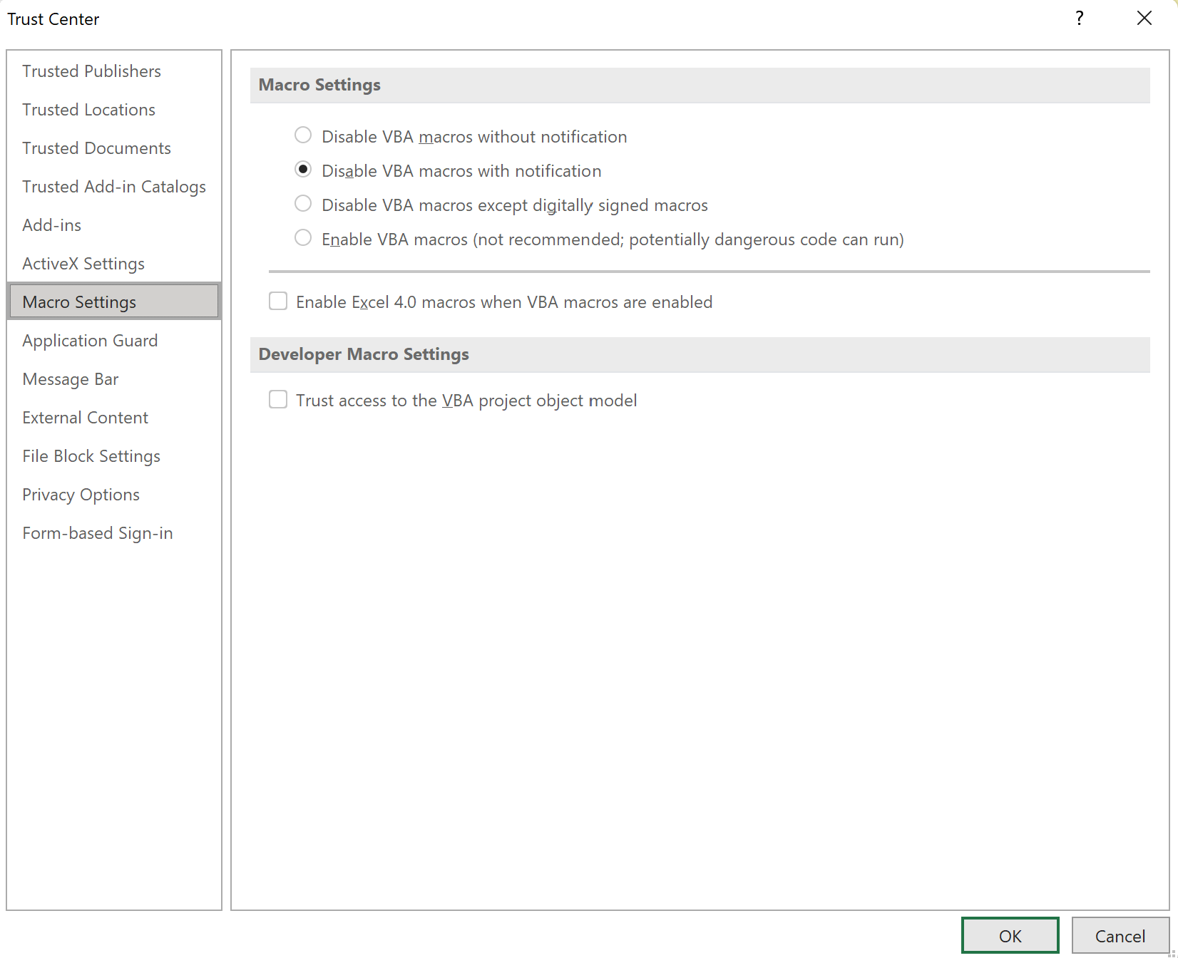 通知なしでXLMマクロを無効にするには、チェックボックスの設定を解除してください(推奨)
